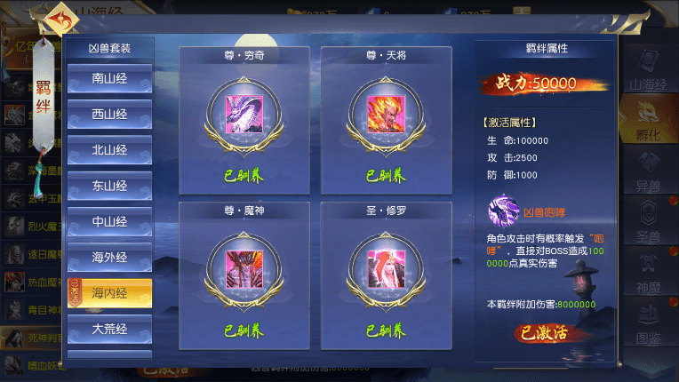 凶兽激活: 激活凶兽后可以获得凶兽合击技能,这些技能可以提高玩家打 BOSS 的效率,增强战斗能力。