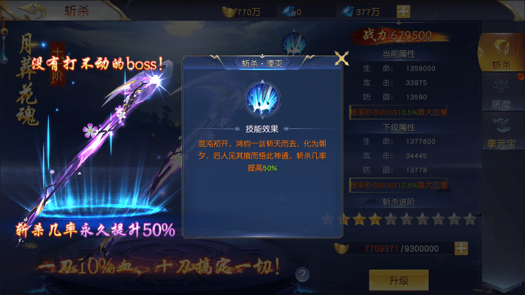 提升斩杀等级: 通过花费元宝可以提升斩杀等级,等级越高,触发斩杀的概率越高。此外,还有斩杀的被动技能,永久性提高50%的斩杀概率。