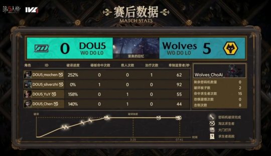 DOU5的求生者选择了勘探员、舞女、野人、“慈善家”(BAN歌剧演员);成都Wolves的监管者ChoAi选择了蜡像师。(BAN祭司、昆虫学者、佣兵、古董商)