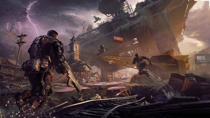 在首度公开的游戏CG中,玩家角色身着帅气的可穿戴外骨骼“Exo-rig”,以极具机动性的弹跳、滑翔等方式进行移动。战场环境危机四伏,除了敌人之外,还有龙卷风等自然天象的阻挠。