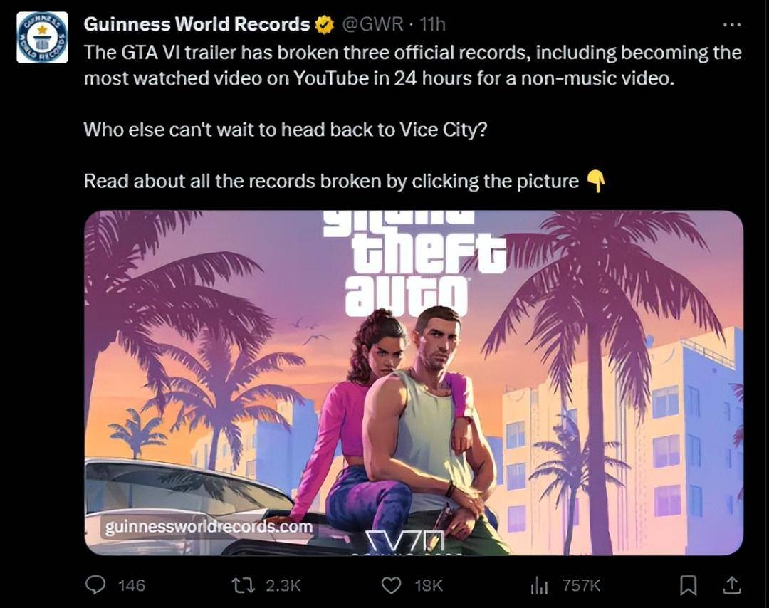 吉尼斯世界纪录宣布,《GTA6》的首支预告片打破了YouTube24小时观看次数最多的游戏视频、YouTube或赞最多的游戏预告、YouTube24小时内观看次数最多的非音乐视频。
