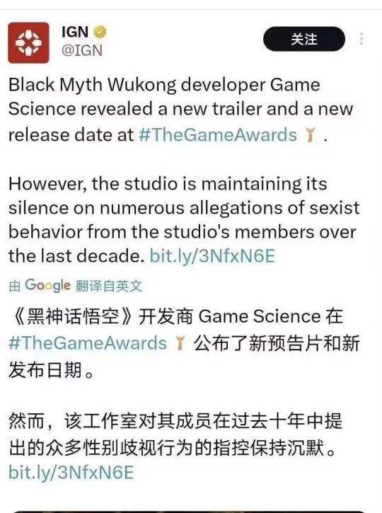 不过IGN倒是真急了,就在TGA黑神话公布发售日时,IGN再度发文表示,“该工作室对其成员过去十年中提出的众多性别歧视行为的指控保持沉默”。
