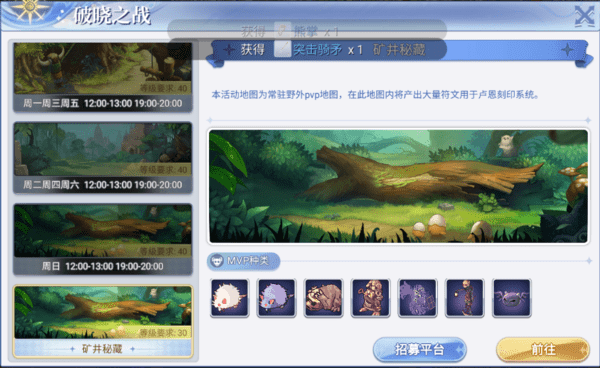 1.矿井秘藏,这个活动地图全天开放,等级要求是30级。在这个PVP地图中,玩家们可以随意攻击彼此。该地图还会定时刷新MVP怪物,玩家们需要合作击败这些强力的怪物。