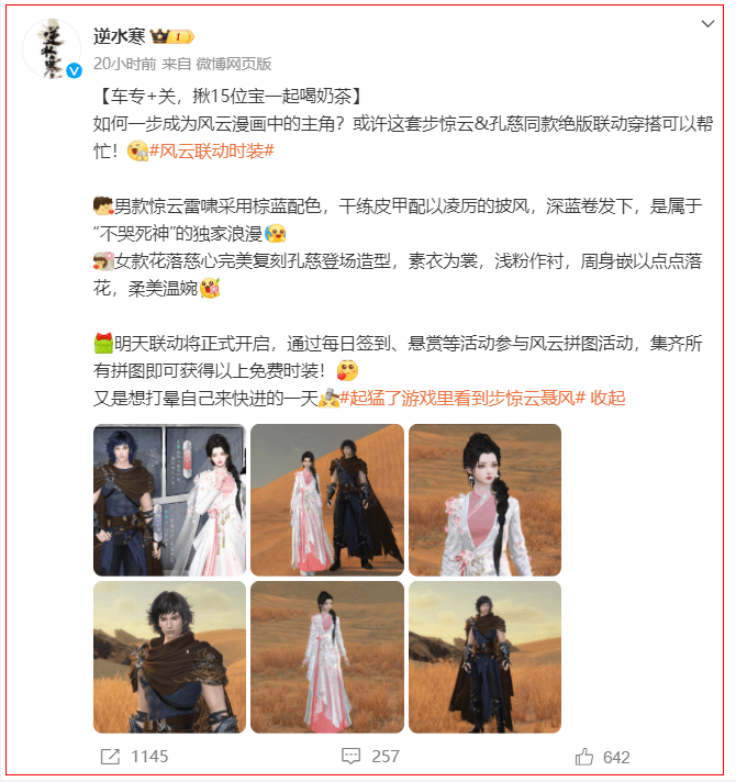 是的,这段时间《逆水寒》不知道抽了什么风,游戏内外的福利活动层出不穷,甚至就连以往游戏主营收入的时装外观、祥瑞坐骑都免费送出了不少。