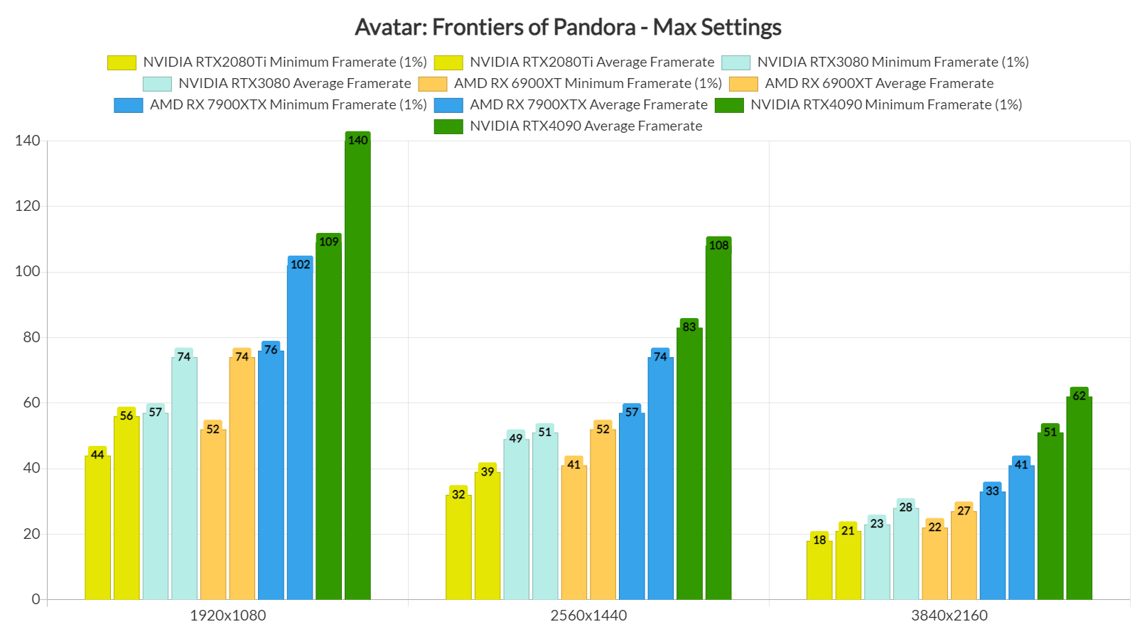正如我们所说,《阿凡达:潘多拉边境》使用了许多光线追踪效果。因此,这不足为奇,它是一个需求非常苛刻的游戏,尤其是在原生分辨率下。在1080p/最高画质设置下,唯一可以始终提供60fps以上帧率的显卡是AMD Radeon RX7900XTX和NVIDIA RTX4090。至于NVIDIA RTX3080和AMD RX6900XT,它们仍然能够提供流畅的游戏体验。不过,这样一来,你就需要一台G-Sync/FreeSync显示器。