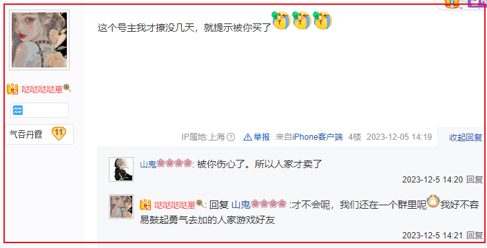 帖子刚刚发出来,就出现了上百个回复,有玩家表示自己为了买这个号,提前几天就开始撩这个号主,已经撩了好几天,就发现已经被卖了,人都麻了!
