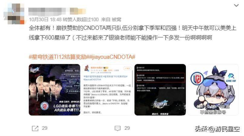 就在两个月前,《星铁》官方宣布他们将会赞助AzureRay和LGD战队出征TI12,而在两个队伍分别取得了季军和四强的成绩后,官方也在游戏中向玩家们发放了600星琼以示庆祝,同期甚至还邀请到“毒奶老仙”黄旭东来为《星铁》战队加油助阵,场面好不热闹。