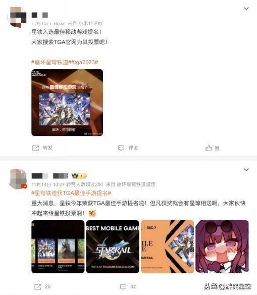 待我一番探究之后,终于给我发现不同寻常的现象——TGA相关话题讨论出现了大量手游玩家,而其中有不少是《崩坏:星穹铁道》的粉丝。