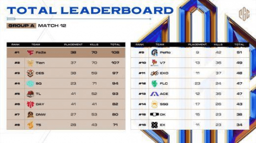 小组赛A组:FAZE战队以吃鸡两把和70分的击杀数优势,占据了榜首,而TIan战队与之仅相差了一分,屈居第二。经过重重的对抗,最终FAZE、天霸电子竞技俱乐部 、CES、Soniqs电子竞技俱乐部 、TYLOO俱乐部PUBG分部 、DAY、DNW、T5分别名列前8,晋级胜者组。