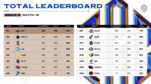 小组赛B组:相较于A组,B组的对战就激烈了不少,特别是排行第1和第2的NH和AZLA,直接获得了相同的分数位列前2,而17战队以4分之差,屈居第3名,但依然成功晋级。本组晋组胜者组的名单为:NewHappy电子竞技俱乐部 、AZLA、17Gaming电子竞技俱乐部、LG、LGC、FUT、TWIS、QM。