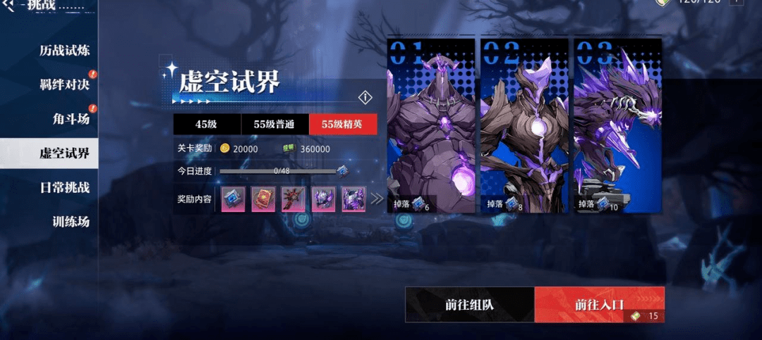 6、虚空试界:在达到55级后开启,虽然也是组队副本,但每天可以挑战无限次数,只是在挑战时会消耗15点能量。挑战成功后有几率获得限定装备,可以在对应的商店自行兑换。