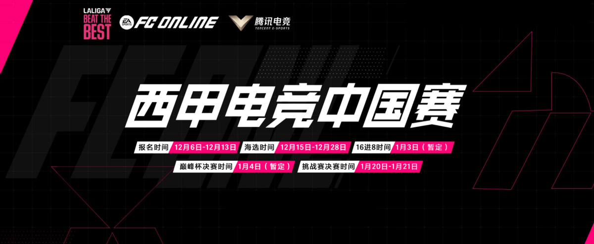 目前,西甲电竞巅峰杯的报名仍在继续,截止至12月13日,任何水平、任何资历的FC系列游戏玩家均可报名参与此次赛事。不久之后,我们即将见证这场宏大赛事的开幕启航,祝福每一位参赛选手,FC的绿茵等待着所有心怀梦想之人!