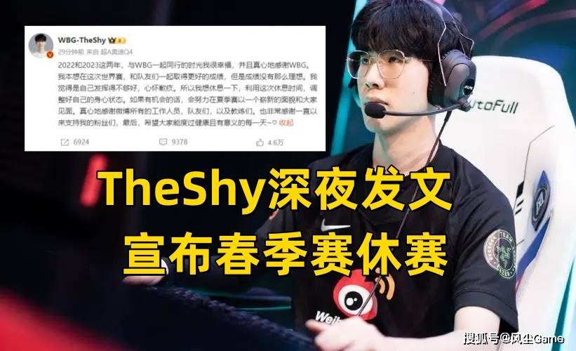 TheShy在文中表示,S13世界赛,本想和队友一起拿到一个好的成绩,但由于自己发挥得不够好,所以成绩就没那么理想,心怀愧疚的情况下,TheShy选择暂时休赛,调整一下自己的身心状态,后续TheShy表示,如果有机会的话,在夏季赛自己会重新回到赛场,继续征战。