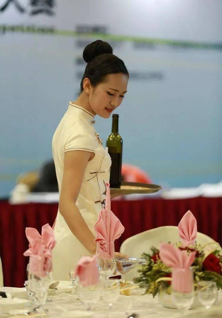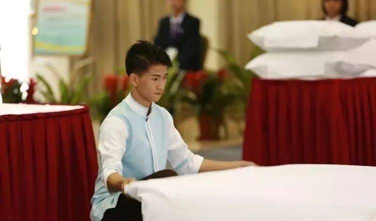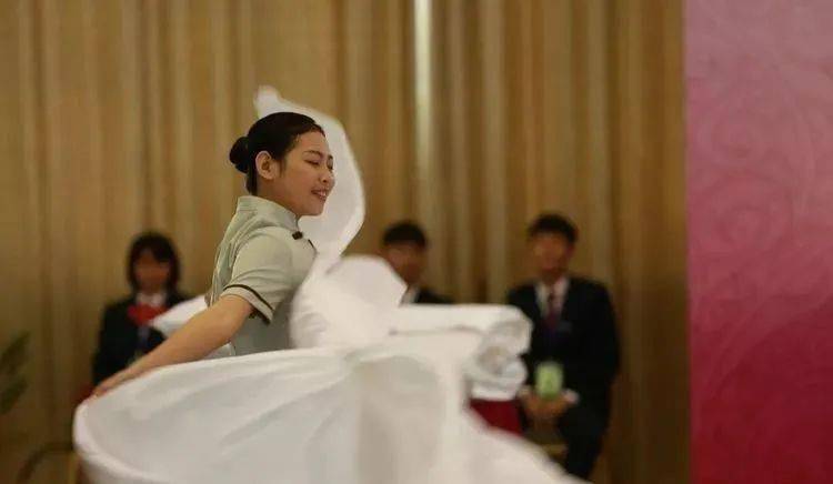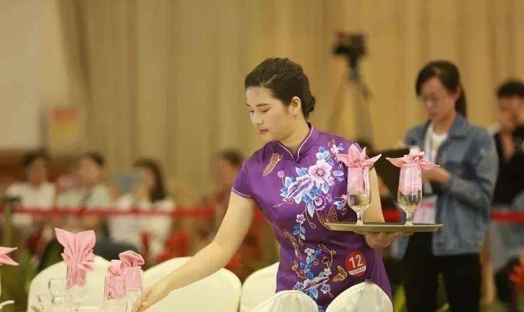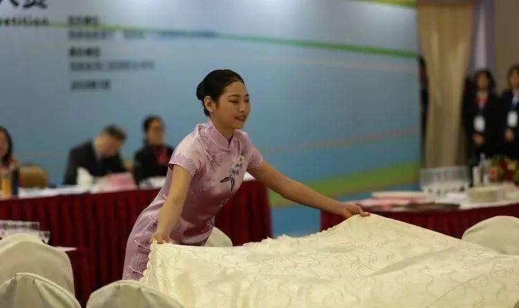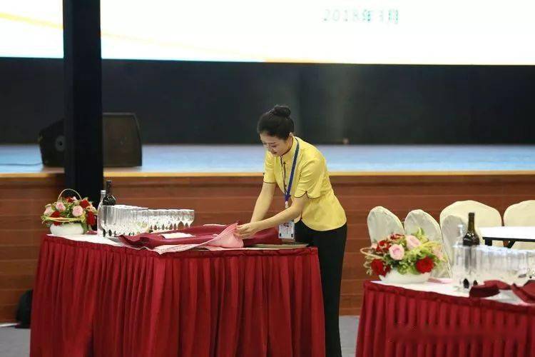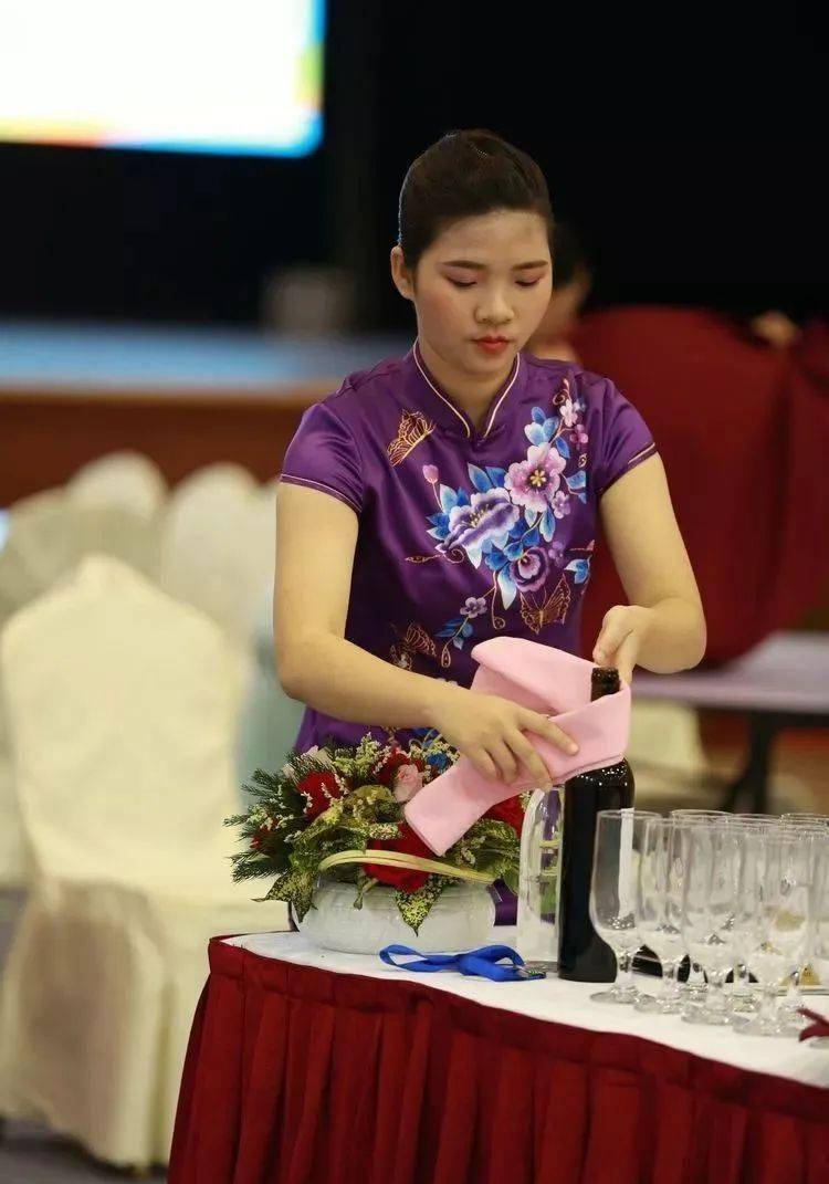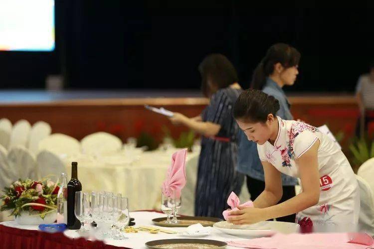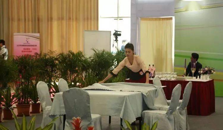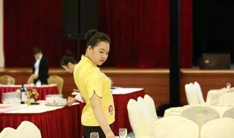 ⑩托盘斟酒:将斟倒酒水装盘,从第一主宾位开始,连续五个餐位,每个餐位换瓶斟酒,先葡萄酒后白酒共十杯;左手托盘,右手持瓶斟酒,酒标朝向客人,斟酒时瓶口不碰杯口;斟酒量均匀,葡萄酒二分之一杯、白酒三分之二杯,斟倒时做到不滴不洒;服务操作时托盘展开,姿势正确、保持平衡、位置合理。 (3)台布、装饰布的折叠方法:反面朝里,沿凸线长边对折两次,再沿短边对折两次。 (4)酒水准备:比赛斟酒所用葡萄酒为食用葡萄汁和水兑制而成,比赛斟酒所用白酒用水代替。葡萄酒杯和白酒杯每批次撤换一套; 每位选手配一瓶比赛用葡萄酒和一瓶比赛用白酒。
