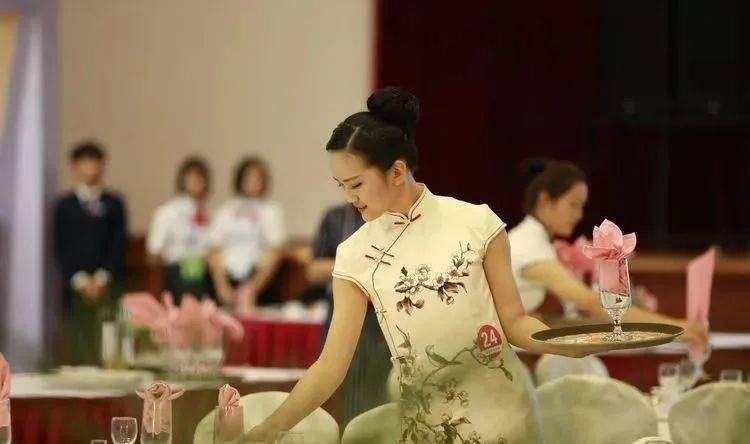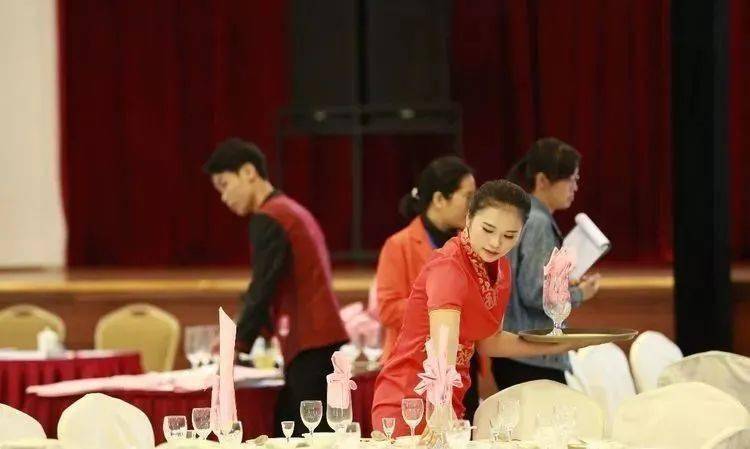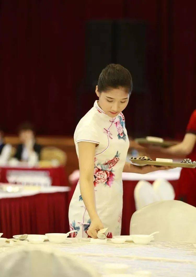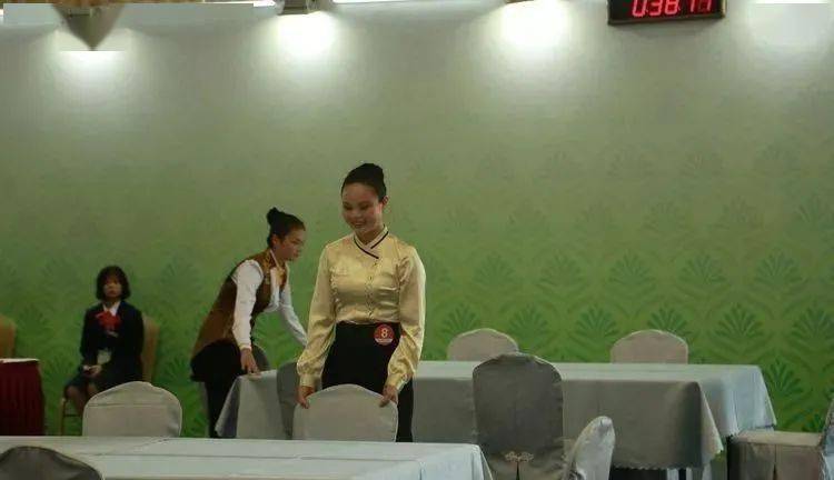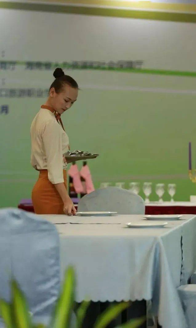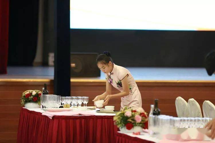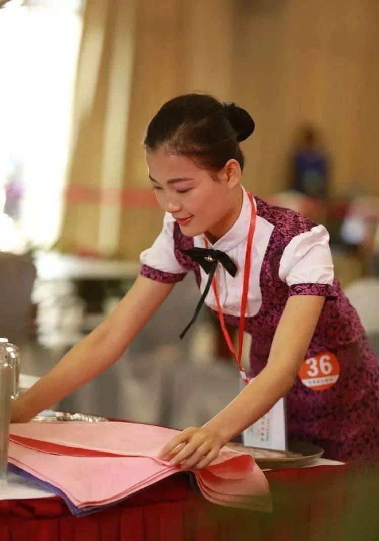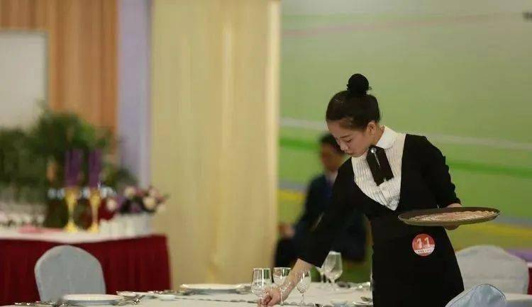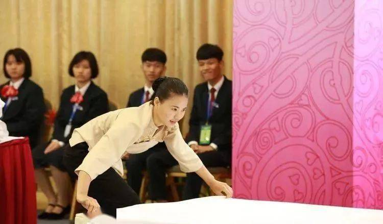 ⑩托盘斟酒:将斟倒酒水装盘,从第一主宾位开始,连续五个餐位,每个餐位换瓶斟酒,先葡萄酒后白酒共十杯;左手托盘,右手持瓶斟酒,酒标朝向客人,斟酒时瓶口不碰杯口;斟酒量均匀,葡萄酒二分之一杯、白酒三分之二杯,斟倒时做到不滴不洒;服务操作时托盘展开,姿势正确、保持平衡、位置合理。 (3)台布、装饰布的折叠方法:反面朝里,沿凸线长边对折两次,再沿短边对折两次。 (4)酒水准备:比赛斟酒所用葡萄酒为食用葡萄汁和水兑制而成,比赛斟酒所用白酒用水代替。葡萄酒杯和白酒杯每批次撤换一套; 每位选手配一瓶比赛用葡萄酒和一瓶比赛用白酒。