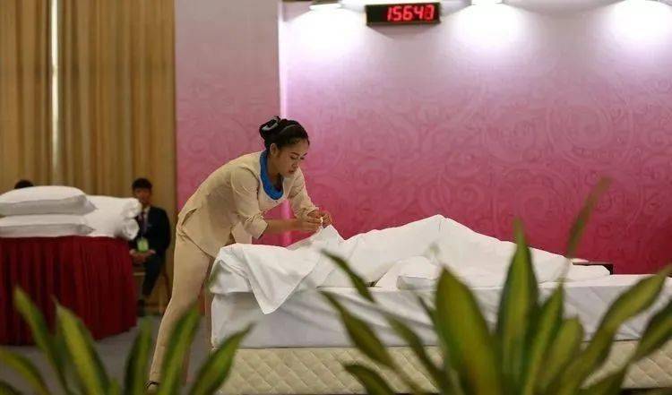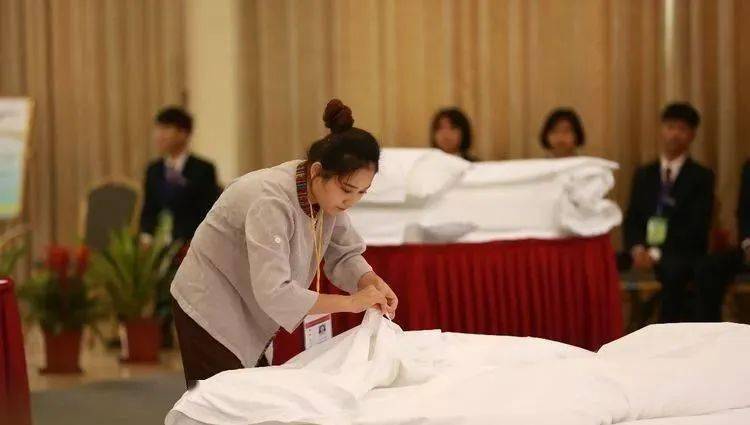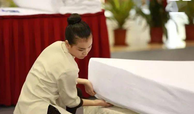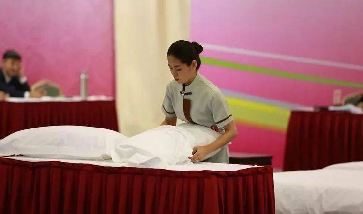 (4)套枕套:将枕芯平放在工作台上,撑开枕套口,将枕芯往里套;抓住枕套口,边提边抖动,使枕芯全部进入枕套里面;将超出枕芯部分的枕套掖好,枕套开口包好不外露,并把枕套口封好;套好的枕头须四角饱满、平整,且枕芯不外露。 (5)放枕头:枕头放置于床头中央,枕头边与床头平齐,枕头开口朝下并反向床头柜,放好的枕头距床两侧距离均等,整个枕头表面平整、光滑、无皱折,枕套中线与床单中线在一条线上。 (6)外观:床铺整齐美观,整张床面挺括,三线对齐。 (7)总体印象:竞赛中,选手操作规范、自如,轻松紧凑,动作优美,技术娴熟,不能跑动、绕床头、跪床或手臂撑床,不重复。 (8)其他 ①床单和被套叠法:正面朝里,沿长边对折两次,再单边朝里沿宽边对折两次。折好后的床单和被套单边朝前、朝右。枕套叠法:沿宽边对折,开口朝上,单边朝前。被芯折叠法:S 型折叠,再两头向中间折,然后对折。 ②选手不可在床头操作,其余位置不限。 ③床架(含脚)+床垫高度为 47 厘米(误差 1 厘米)。