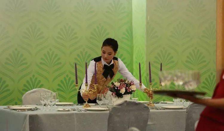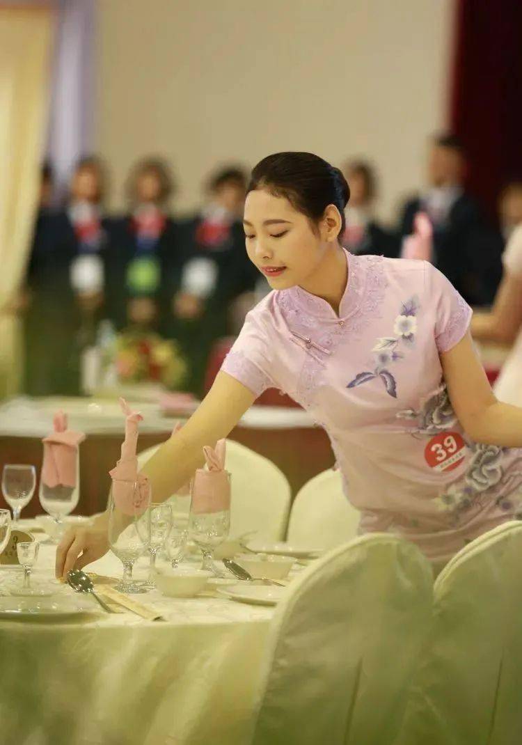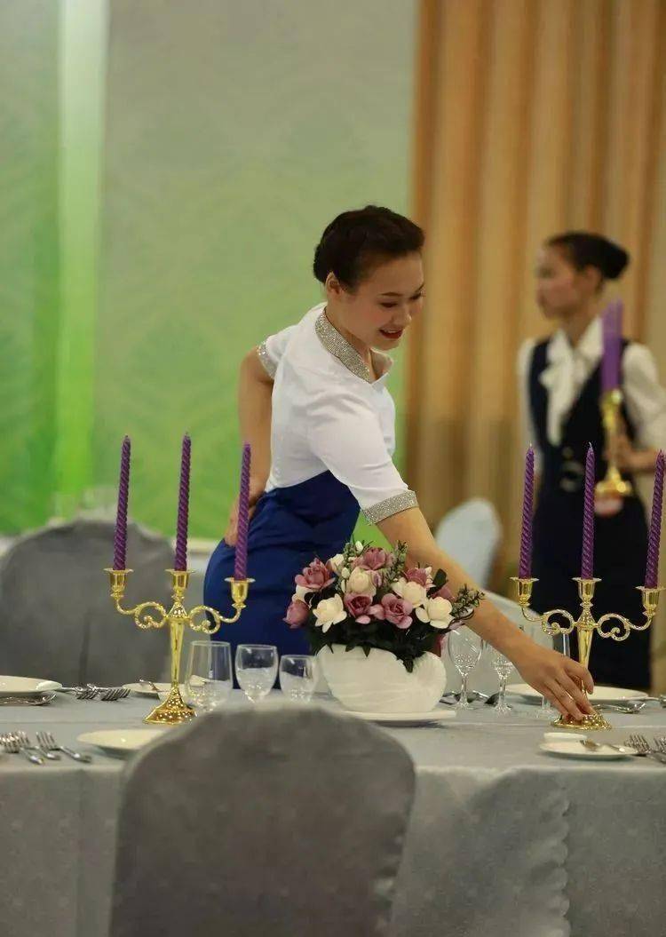 ⑥摆放公用餐具:公用筷架摆放在主人和副主人餐位水杯正上方,距水杯肚下沿切点 3 厘米,公勺、公筷置于公用筷架之上,勺柄、筷子尾端朝右。先摆放杯花,再摆放公用餐具。 ⑦折餐巾花:折十种不同造型杯花,每种餐巾花三种以上技法;花型突出正、副主人位;有头尾的动物造型应头朝右,主人位除外;巾花观赏面向客人,主人位除外;巾花挺拔、造型美观、款式新颖;操作手法卫生,不用口咬、下巴按、筷子穿;手不触及杯口及杯的上部。水杯待餐巾花折好后一起摆上桌。 ⑧上花盆、菜单(2 个)和桌号牌:花盆摆在台面正中;菜单摆放在正副主人的筷子架右侧,位置一致,菜单右尾端距离桌边 1.5 厘米;桌号牌摆放在花盆正前方、面对副主人位。 ⑨拉椅让座:先拉第一主宾位,后按顺时针方向逐一定位,示意让座;座位中心与餐碟中心对齐,餐椅之间距离均等,餐椅座面边缘距台布下垂部分 1 厘米;让座手势正确,体现礼貌。