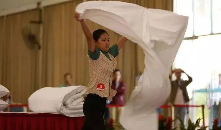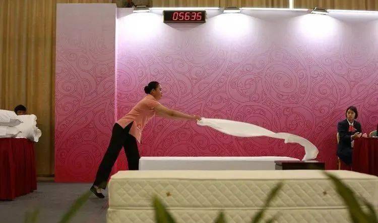 5.选手在裁判员宣布“比赛开始”后开始操作。 6.操作结束后,选手立于工作台前,举手示意“比赛完毕”。 7.比赛用床架不带床头板,设床头柜,靠近床头柜一头为床头。 8.操作过程中,选手不能跑动、绕床头、跪床或手臂撑床,每违例一次扣 2 分。 9.客房中式铺床程序和标准 (1)整理床垫(准备工作时):位置正确、平整,四边平齐,床垫无污迹、无毛发、无破损,床垫拉正对齐。 (2)抛铺床单:开单、抛单、打单定位一次成功;中线居中,不偏离中线;床单正面朝上,表面平整光滑;包角紧密垂直且平整,式样统一;四边掖边紧密且平整。