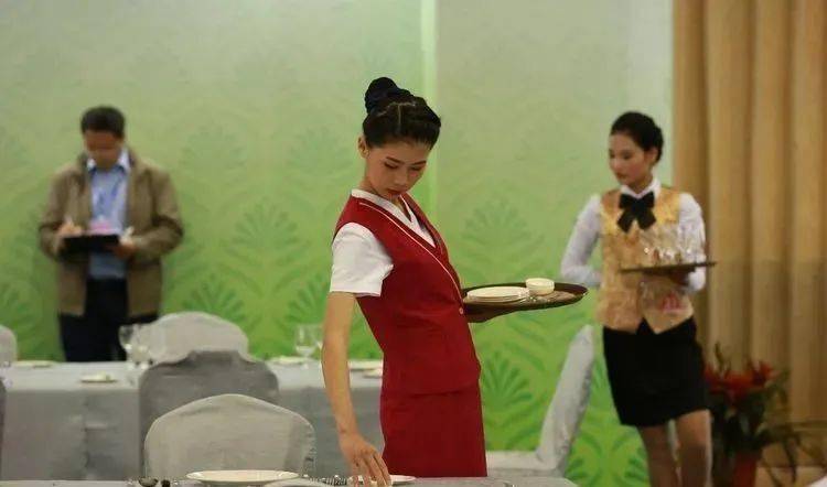 (13)托盘使用:餐件和餐具分类按序摆放,符合操作要求,杯具在托盘中杯口朝上。 (14)综合印象:距离匀称,整齐美观,布件颜色协调、美观,操作过程中动作规范、娴熟、敏捷、声轻,姿态优美,能体现岗位气质。
