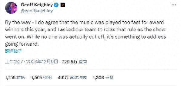 今年TGA的获奖者都有30秒的时间来发表感言,之后就会响起音乐来进入下一个环节。杰夫说他“要求我们的团队在节目进行时放宽(30秒)规则”,事实上的确没有获奖者因为音乐响起而被迫结束获奖感言,但这仍旧是杰夫和他的团队“未来需要解决的问题”。