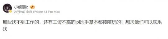 值得一提的是,圈内知名的陪玩店老板小虞姬,也在近期发布过一则动态,表示找不到工作和工资不高的LPL选手基本都接陪玩。不知道在接下来的这几个月,大伙能否看到他俩的合作了。
