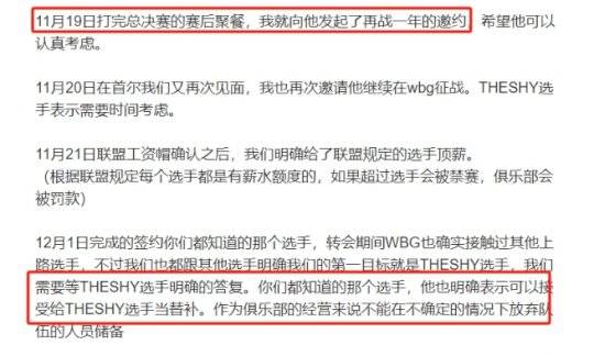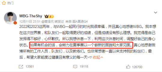 关于The Shy这次的休息,WBG经理在第一时间发文表态,称总决赛打完后就对其发起过再战一年邀约,新签的上单选手也表示愿意替补。不过The Shy最终还是选择了休息半年,或许他也有自己的考虑吧。