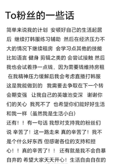 面对粉丝群的水友们,Huanfeng简单表述了自身的计划:“安顿好自己的生活起居后,继续打韩服练习辅助,然后在经济压力不大的情况下继续租房。会学习点其他的技能,比如语言,健身,剪辑之类的,会尝试接触。我也会试着挣一点钱,因为需要钱维持房租。”