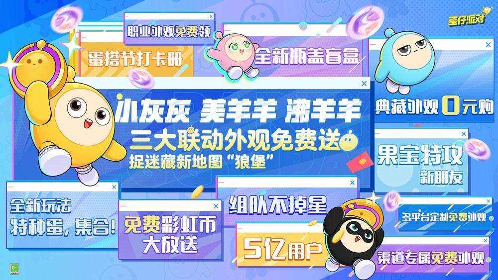新的成就,新的起点,还有来自青青草原和果冻武术学院的新朋友踏上前来道贺的旅途,给蛋仔们带来新的惊喜与陪伴。12月15日,《蛋仔派对》与《喜羊羊与灰太狼》再次联动,共创小灰灰、美羊羊和沸羊羊三款外观,蛋仔们只需完成活跃任务,就可免费获取三款皮肤。捉迷藏地图【狼堡】也将同步上线,蛋仔们可以再游戏中重温童年经典!