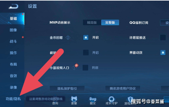 2、然后进入到设置页面,左侧功能栏滑动到最下方点击【功能/隐私】;