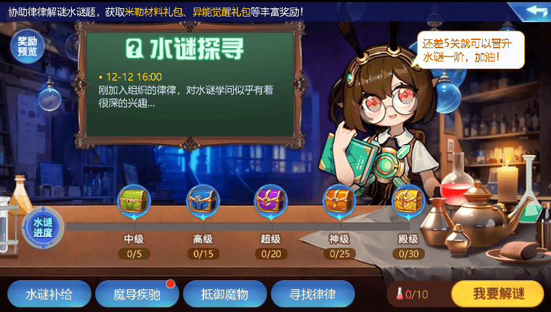 收集水谜溶剂,协助律律解开水谜题,赢取异能觉醒礼包、米勒材料礼包、云峦连珠卡、精淬之锤、正义光辉、粉钻星芒等丰厚道具奖励!