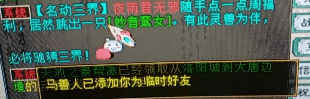 1、红叶分秋玩家说打完帮战累了,就随手点了下新服名动三界活动的周福利,然后就得到了一只妙音鸾女,巧的是召唤兽栏满了,幸好当时没着急下线。