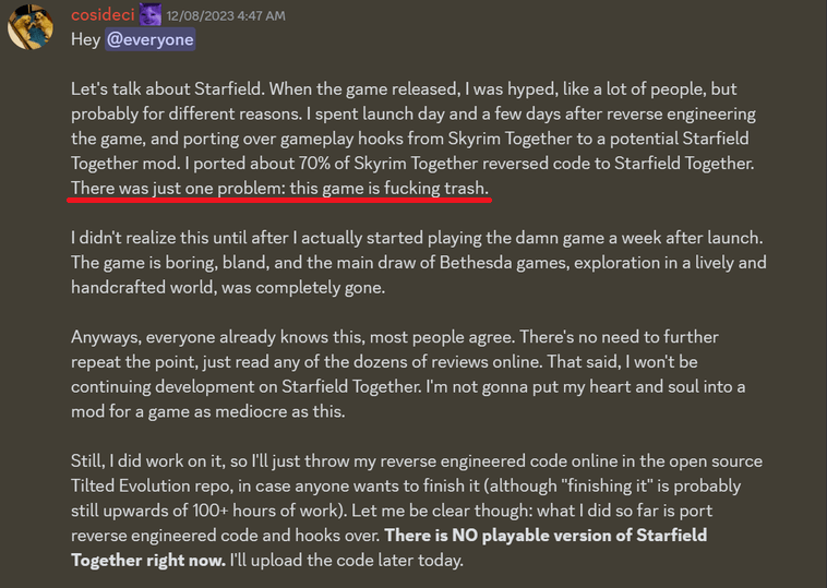 Cosideci透露,当《星空》发售时,他就已经在做逆向工程,将《上古卷轴5》联机模组的70%代码移植到《星空》这边,过程很顺利。唯一的问题是,“这款游戏就是垃圾”。
