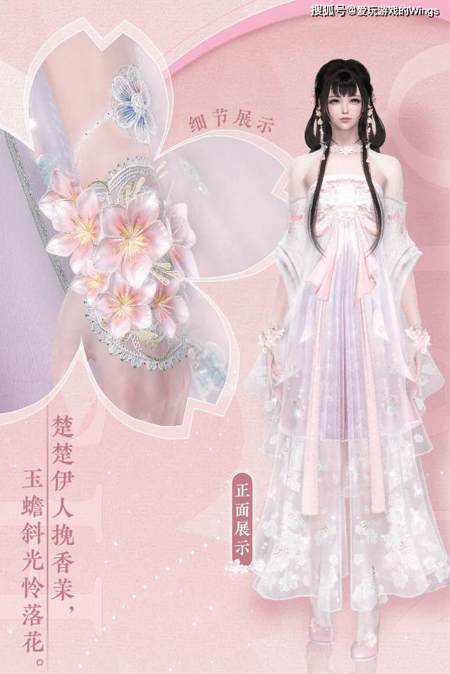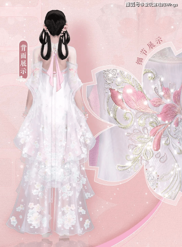 比较让我惊喜的是这套时装对于发型的设计,正面流出两绺长鬓凸显温婉之感,背面采用“分四股”的设计将头发系成环状,如此设计更能凸显出女性的温柔之感,搭配浅粉的衣装宛若小说中的“白月光”,让人意难平。