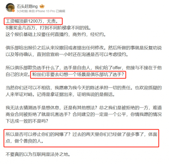 WBG经理透露他们为The Shy开出了1200w的顶薪酬,外加几百万的S赛亚军奖金。其中并不涉及直播约、商业约和经纪约,所以这是一份“无责任合同”。WBG经理对这件事的总结就一句话:“俱乐部没坑选手,接不接offer决定权在他。”