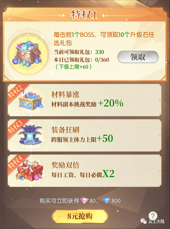 周卡最重要的特权1 每击败一个BOSS获得10个升级石头任选,一个BOSS就是10个石头而冲榜积分消耗1个石头就是10分,那么一个BOSS就是100分。小布的微氪冲榜就建立在这个周卡的特权上。换言之就是用BOSS换分数。
