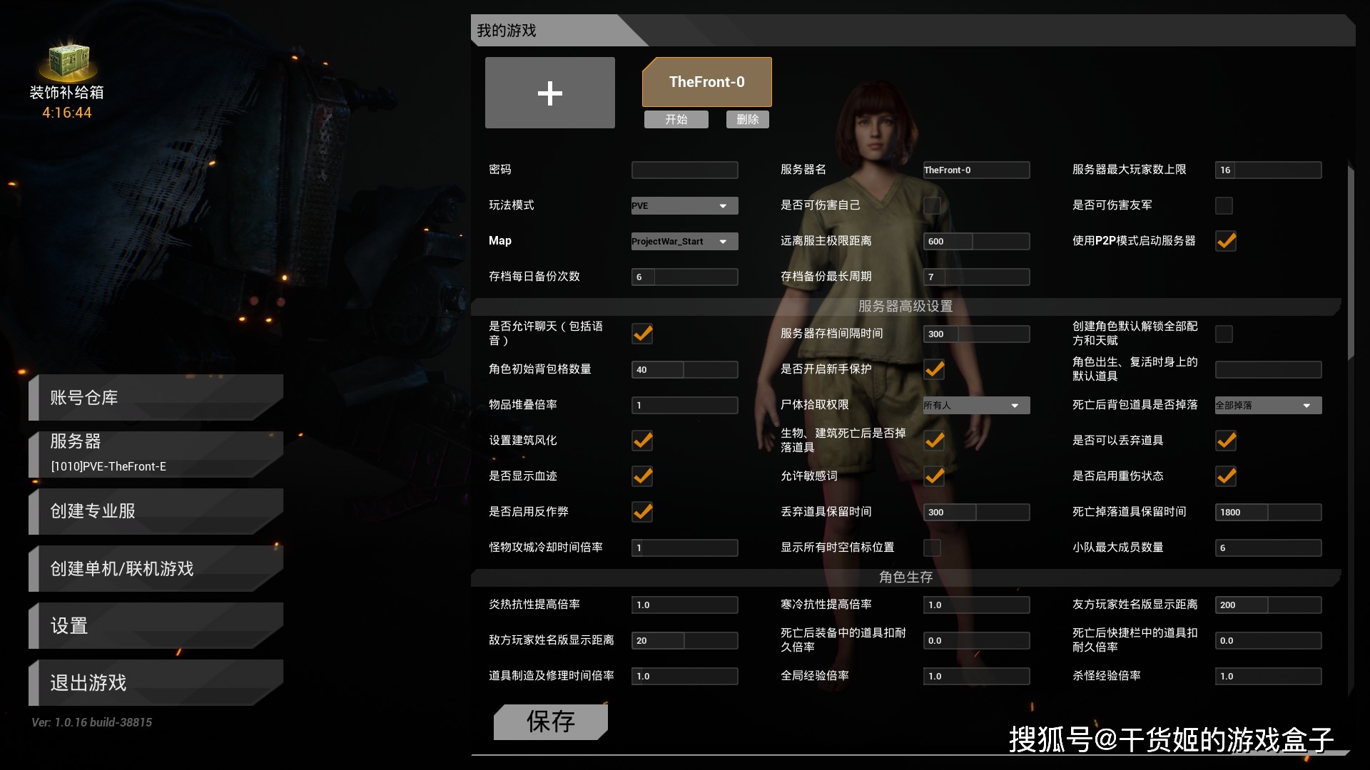 官方服务器目前最大人数上限为80人,PVP会有清档时间,PVE基本不会有采集倍率选择等等,而专业服务器更像私服了,专业服务器和单机/联机游戏模式都可以自己设定人数上限,选定服务器后就可以自定义人物开始游戏了,人物数据是不互通的,每切换一个服务器就需要重新创建你的人物角色。