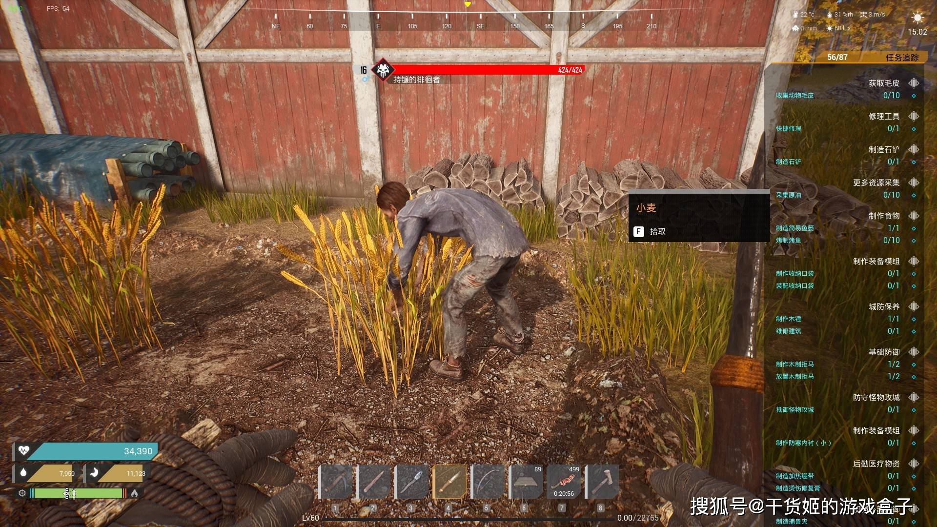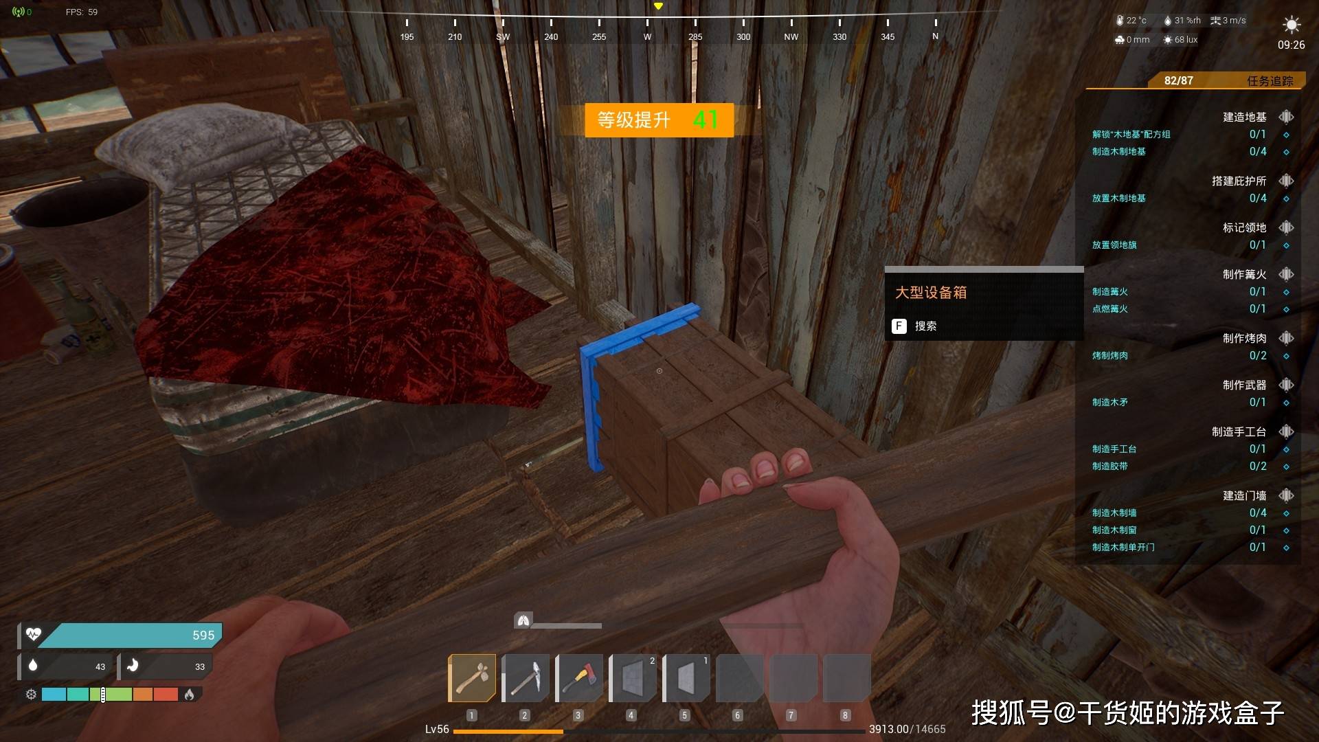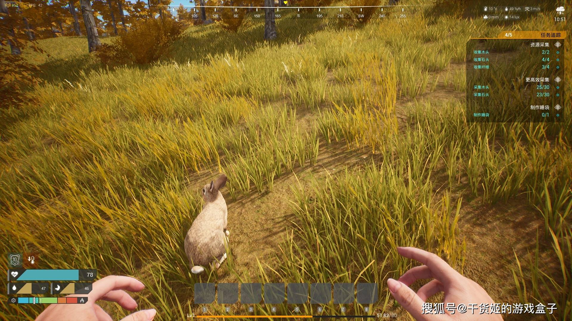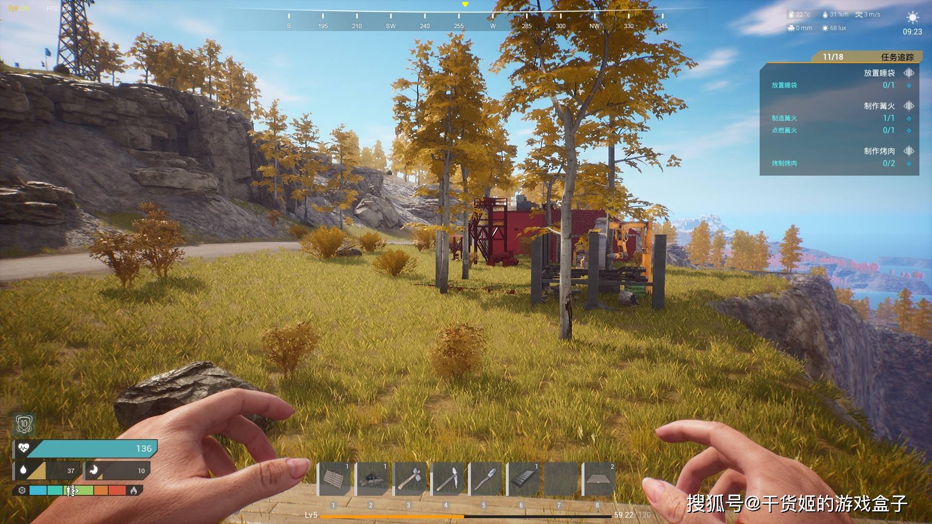 刚开始也是手无寸铁需要收集木头和石头去制作工具进行采集,还要注意不要招惹敌人,作为新手不小心直接被巡逻兵打死,结果背包道具全部掉落要重新找尸体或者重新肝了,你可以跟随任务进行采集、制作、建造,注意血量、水份、饱食度、耐力等生存元素,循序渐进了解游戏的玩法,还是那句话,如果你是个生存游戏的老玩家,那么上手就非常快。
