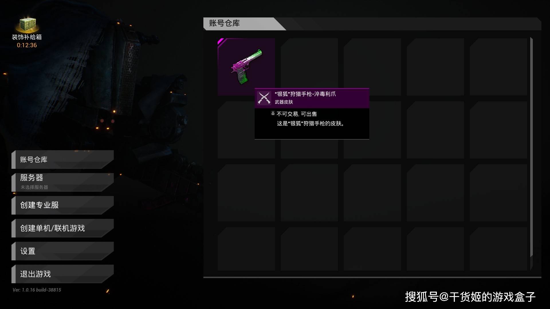 游戏开始能看到左上角的装饰补给箱获得时间,获取之后在账号仓库可以开启你获得的箱子获取到武器皮肤,比如个人刚刚领到的银狐狩猎手枪-淬毒利爪,可以在社区市场进行出售交易,瞬间感觉新的理财产品出现了!