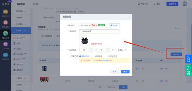 奖品分为实物奖品和现金红包(单个红包最低金额为1元),每轮游戏中可添加多种奖品