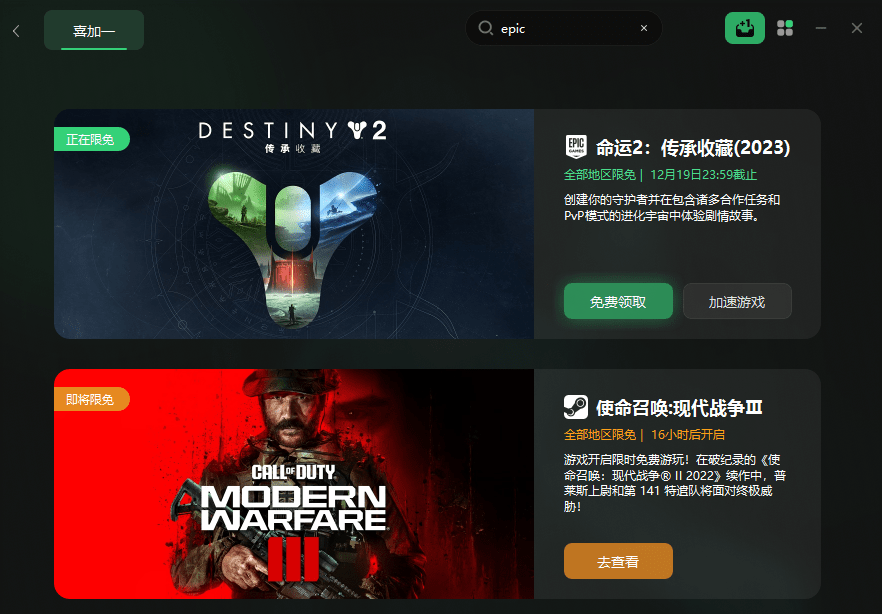 第五步:登录完成后,进入EpicGames商城。在商城页面中,找到标有“免费游戏”的专栏。在该专栏中,你可以浏览所有可用的免费游戏并选择你感兴趣的游戏。找到命运2传承收藏后,点击获取基础游戏按钮即可。