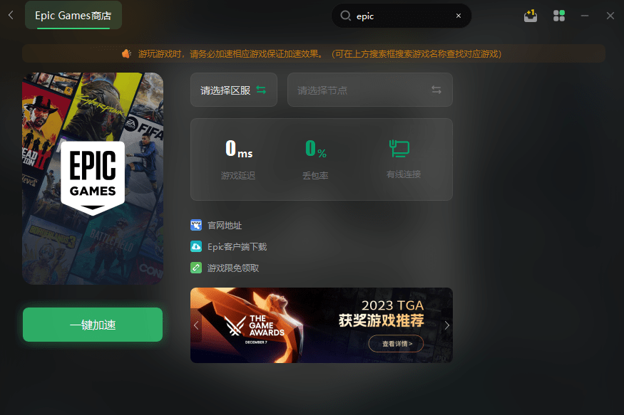 有玩家遇到领取不了的情况,可以打开奇游,搜索"Epic",然后启用网络优化功能,通过奇游的网络优化功能,可以提升玩家本地网络与Epic平台的连接质量,确保能够顺利领取游戏本体,畅玩游戏。