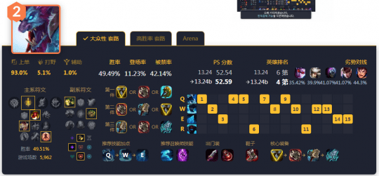 13.24版本中,93%的巨魔出现在上单位置上。与绝大部近战英雄的对抗中,他都是具有优势的。符文点致命节奏,无论是对拼还是带塔都非常好发挥。三相之力+贪欲九头蛇+破舰者这三个核心装一出,他的单带威胁就已经不输武器大师、剑姬了。