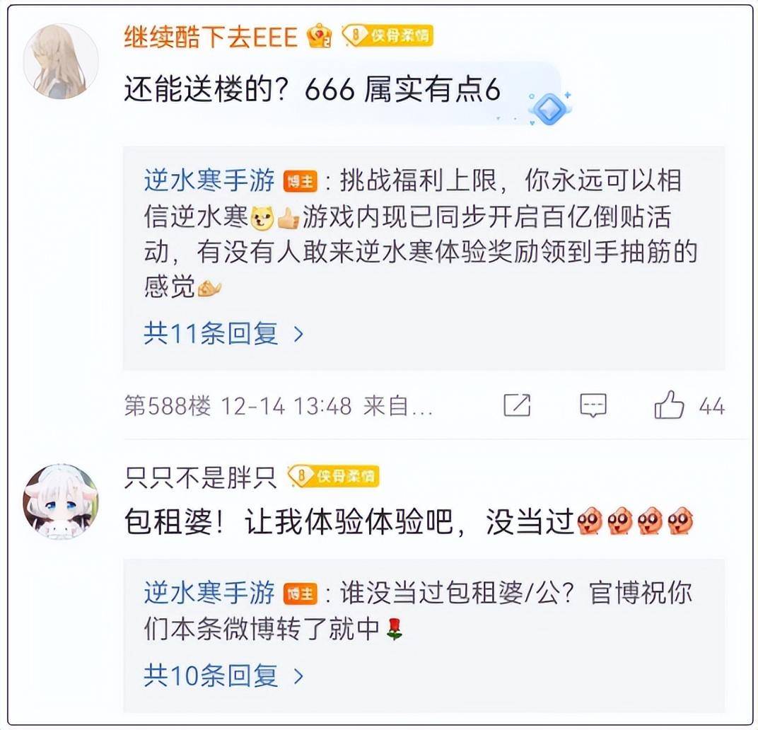 这波霸气的骚操作,让《逆水寒》手游玩家盛赞官方豪气,整个“会呼吸的江湖”已经提前过年;还有人说:“真没当过包租婆,让我体验体验吧。”
