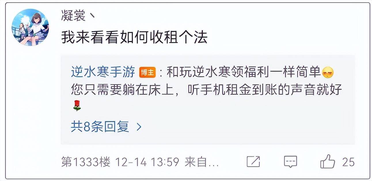 也有玩家表示不相信,就没见过送楼的游戏厂商,因此还问官博:到底怎么个收租法?而官方的答复也十分霸气——就躺在床上,听到“叮”一声响,租金就到账了。