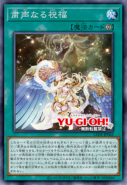 这个卡名的①②效果1回合各能使用1次。①:可以以「粛声なる祝福/肃声的祝福」以外的自己的墓地·除外状态的1张「粛声/肃声」卡为对象发动。将那张卡加入手牌。②:仪式怪兽以外的怪兽以表侧表示召唤·特殊召唤的场合可以发动。将等级合计为要仪式召唤的怪兽的等级以上的、自己的手牌·场上的怪兽解放,从手牌将1只战士族·龙族且光属性的仪式怪兽仪式召唤。用这个效果特殊召唤的怪兽不会被战斗破坏。