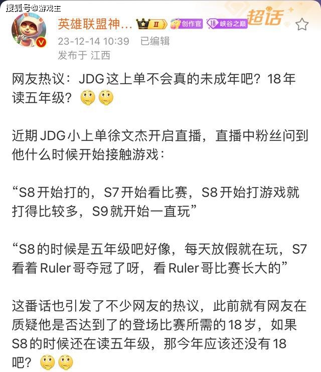 就在最近,jd g战队的小上单徐文杰开启了直播。直播过程当中,粉丝们问到他是什么时候开始接触英雄联盟的。S8赛季的时候开始打的,S7赛季看比赛,S9赛季就基本上是一直玩了。S8赛季的时候好像是五年级,每天放假都在玩S7赛季,看着ruler哥夺冠,可以说是看着ruler的比赛长大的。此番言论引来了大量网友的热议,结合他直播时的画面,很多人都觉得不会是未成年吧。