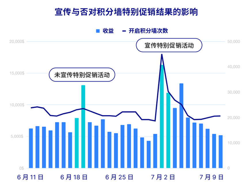 特别促销通常提供 1.5 - 10 倍标准的积分墙奖励来吸引用户参与。当用户完成一些任务,如试玩广告主的游戏并过关,或填写调查问卷后,即可获取这些奖励。通过促销活动,开发者和广告主都可以大幅增加收益,并大规模获取高 ARPU 用户。