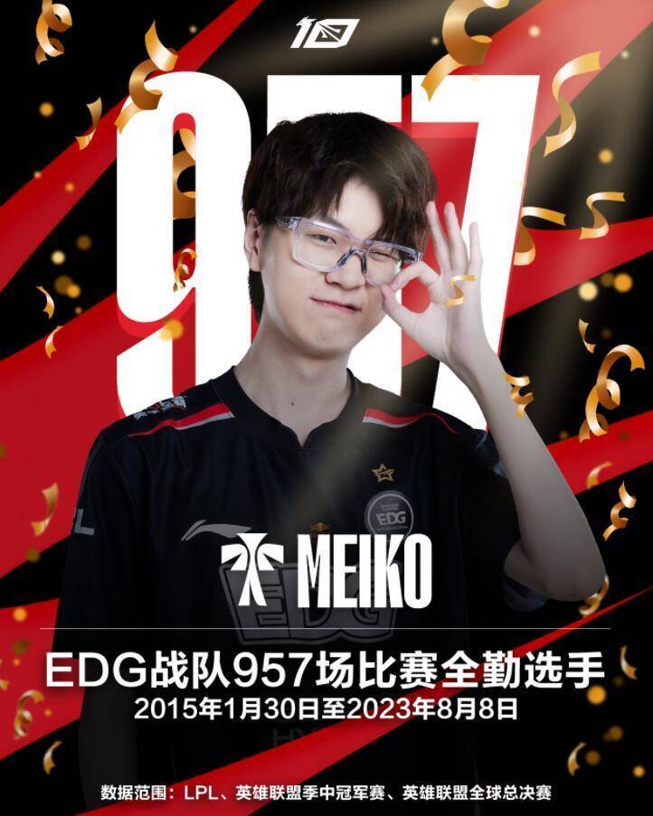 那就是他从2015年1月30日一直到这赛季结束,Meiko选手登上LPL赛场的次数高达957场,在这9年的时光里,meiko从未缺席一场比赛,从来没有因为自身的问题而请假,而且也没听说meiko有什么伤病,因此meiko被调侃身体是铁打的。