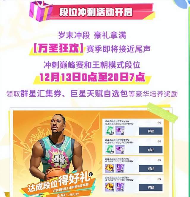 为了庆祝新赛季的到来,在12月13日至12月20日期间,玩家们只需游玩巅峰赛和王朝模式并达到一定段位,就可以领取群星汇集券、巨星天赋自选包等海量培养奖励。培养球星,更好地迎接新赛季的到来吧!