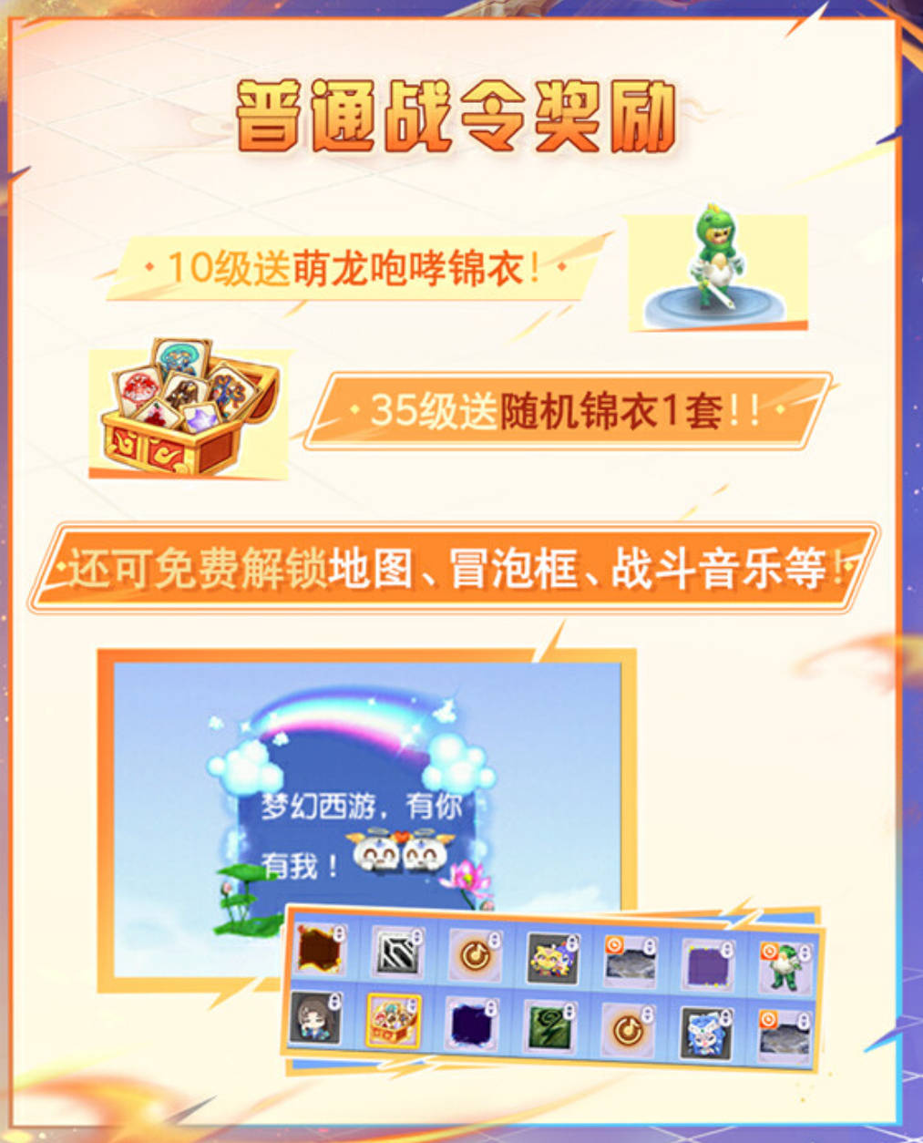战令奖励在自走棋对局中还可以解锁丰富好礼,包含有“萌龙咆哮”专属锦衣一套、随机锦衣一套,更有战斗场景地图、对话冒泡框、战斗背景音乐等好礼相送!